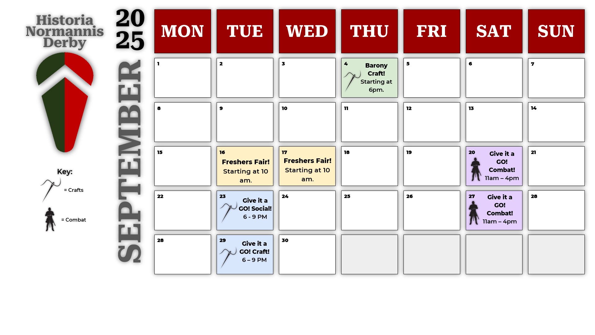 Medieval Reenactment RETURN Calendar 2025/2026 Weekly Craft at the Kedleston Road University Campus: To Be Confirmed Markeaton Park Combat Training Ground: What Three Words ///socket.among.chairs and https://maps.app.goo.gl/FNg1VQbmy5v7TJ7KA Barony Crafts Address: 13-17 Streatham Rd, Derby (Barony Crafts: For experienced crafters to work independently on their projects)