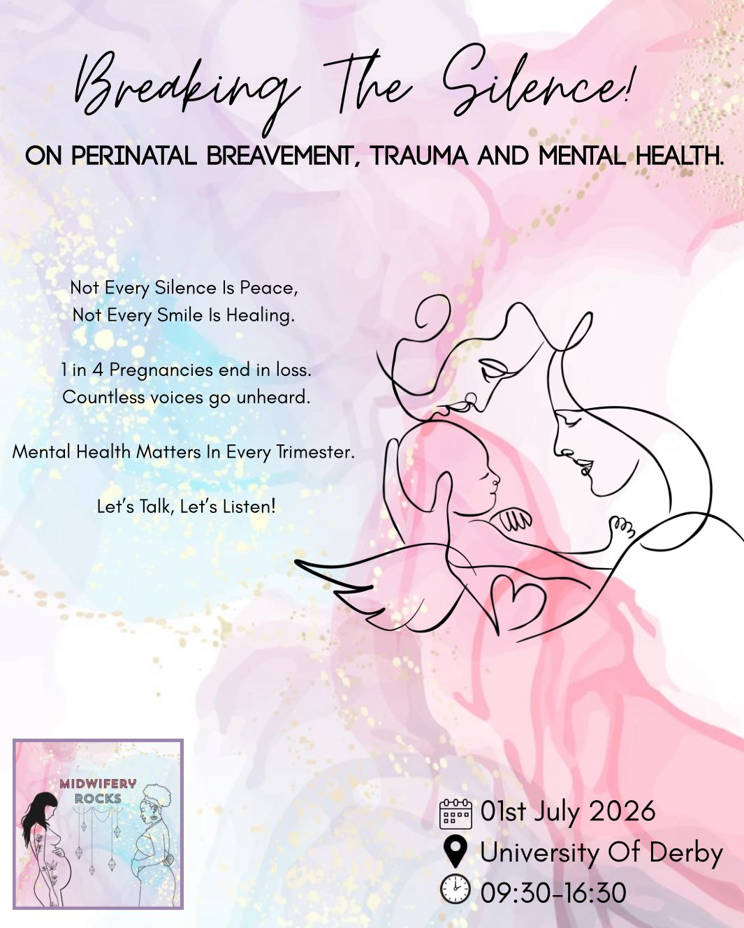 Midwifery ✨ Breaking the Silence Conference 2026 ✨ 🗓️ 01 July 2026 | 📍 University Of Derby. We are proud to announce the Breaking the Silence Conference, a dedicated space to explore the profound impact of perinatal bereavement, trauma, and mental health. This event brings together parents, healthcare professionals, students, and advocates to: 💜 Share stories and experiences 🧠 Highlight the importance of mental health support 🤝 Build community and compassionate care 🌱 Drive change in awareness, policy, and practice Together, we can break the silence and create a world where no family walks this journey alone. 🔗 Tickets now on sale! #BreakingTheSilence #PerinatalLoss #MaternalMentalHealth